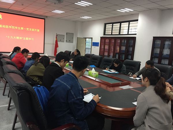 支部书记徐艳首先强调了深入学习贯彻党的十九大精神的重要意义,然后组织大家学习了十九大报告的主要内容和党章修改部分的重要内容。要求全体同志要严格要求自己,发挥模范带头作用,教师党员要不断增强服务意识,做好学生管理服务工作;学生党员要加强学习,夯实专业知识,不断提高政治素养,以实际行动影响和带动同学们深入学习十九大精神。支部党员结合学习分享了心得体会。