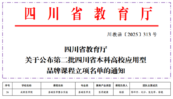 近日,四川省教育厅公布了第二批四川省本科高校应用型品牌课程立项名单,由我校bwin必赢国际官方网站杨拯教授主持,陈环宇、张先琴、刘沙、徐艳、张晓等老师参与建设的《基础医学整合实验》课程凭借鲜明的特色、创新的教学模式以及较好的育人成效成功立项,是学院课程建设方面的又一重要成果。